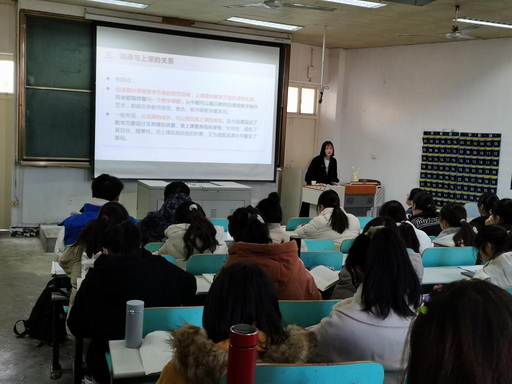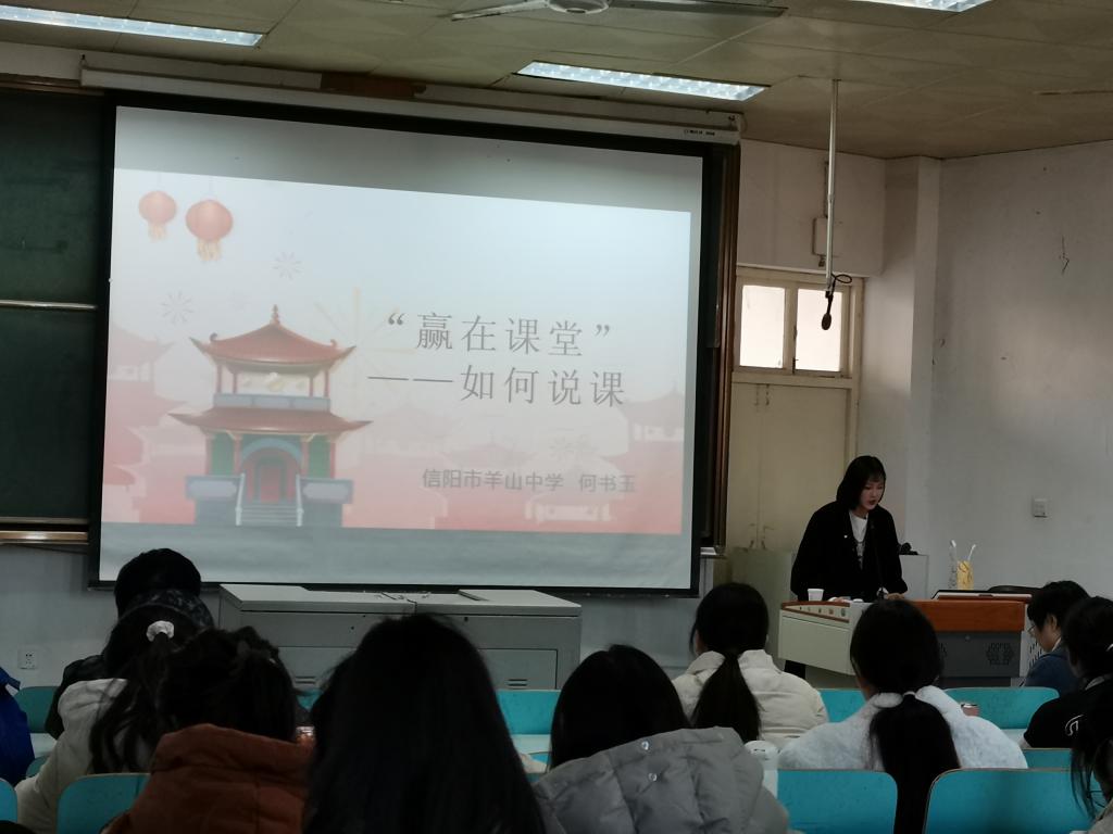 12月2日上午,应我院邀请,信阳市羊山中学教师何书玉莅临我院,为我院师范生作题为《赢在课堂—如何说课》的教学讲座。讲座由tyc522cc太阳成集团副院长孙炜主持,我院2019级师范生和学科教学研究生到场聆听了此次讲座。