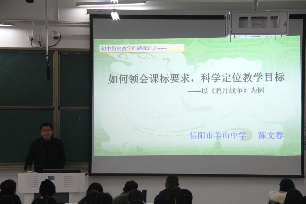 陈文春老师从教二十多年,教学经验丰富,此次报告使学生们加深了对中学新课标的认识,增进了对中学历史教学工作的理解。(供稿人/何晓洁)