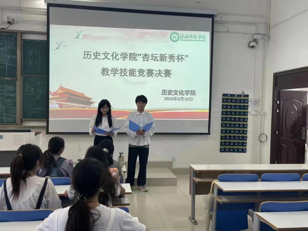 为了提升我院师范生教学技能,培养创新性历史教育教师人才,我院在2023年5月初启动了本年度“杏坛新秀杯”教学技能比赛。比赛分为初赛、复赛及决赛三个赛段。经过初赛、复赛的激烈比拼,共有10名选手进入决赛环节。6月10日上午,决赛在社科楼212教室举行。院长叶宗宝、副院长孙炜、史经霞,教师代表刘阳、张乐锋、邹维一、惠鹏飞,高中历史教师黄学渊、郭艳,研究生代表施博、刘浏烨等担任了此次比赛的评委。
