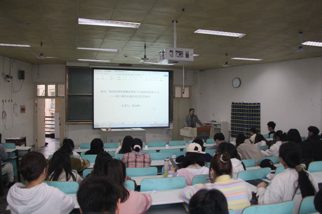 为深化学生对历史时空的认识、了解晚清民国时期豫南移民的外迁情况,4月19日下午,我院邀请张金林博士在人文楼609教室作了主题为“晚清民国时期豫南移民下江南的原因和方式—基于移民后裔历史记忆的探讨”的讲座,22级历史学专业学生参加。