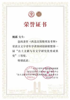 12月7日,“古文字青年学者协同创新联盟”第一届“出土文献与古文字研究优秀成果奖”颁奖典礼在复旦大学举行,我院姚磊老师的著作《西北汉简整理及考释》荣获三等奖。