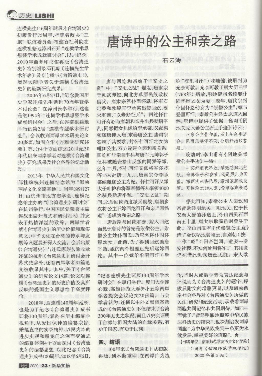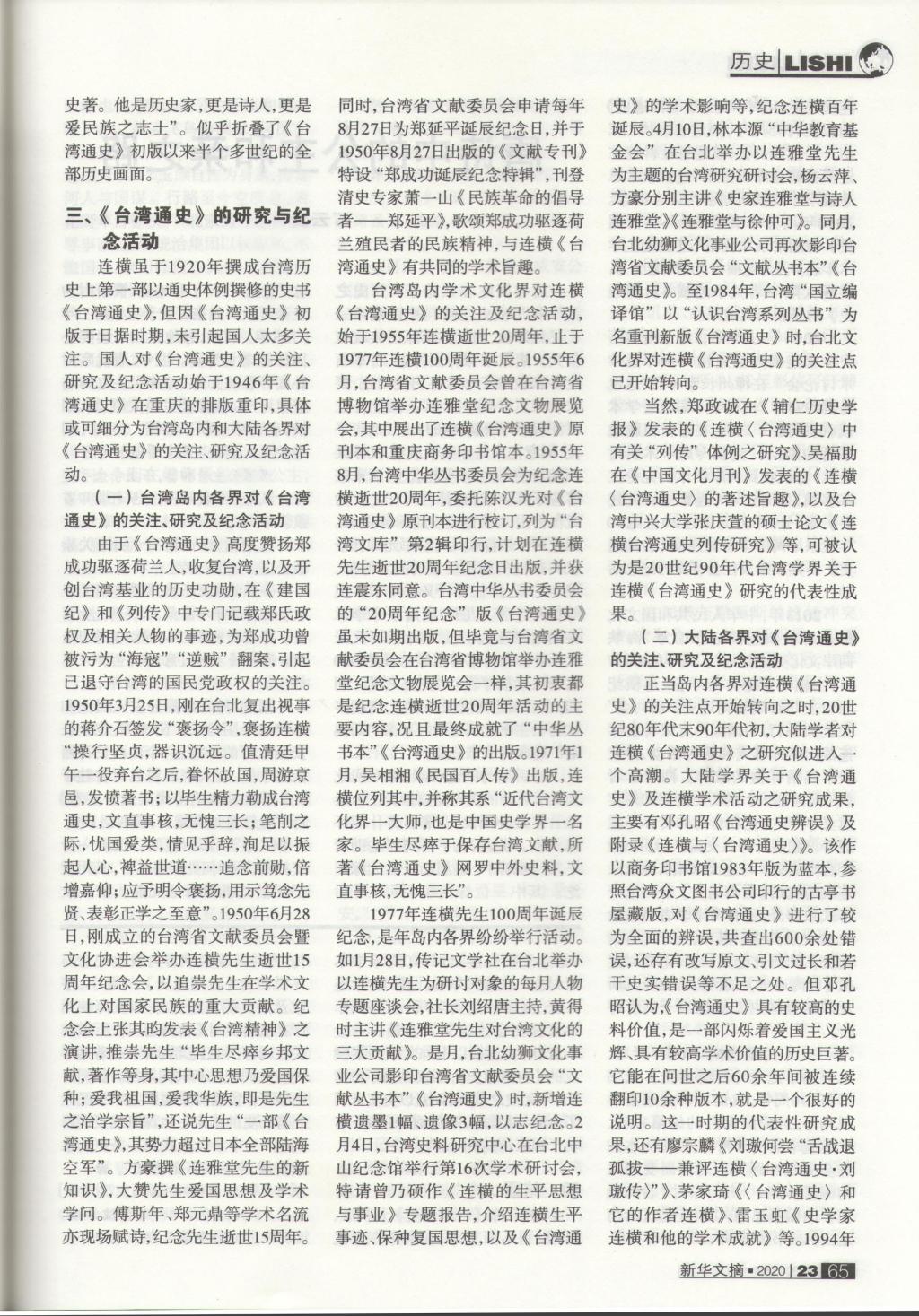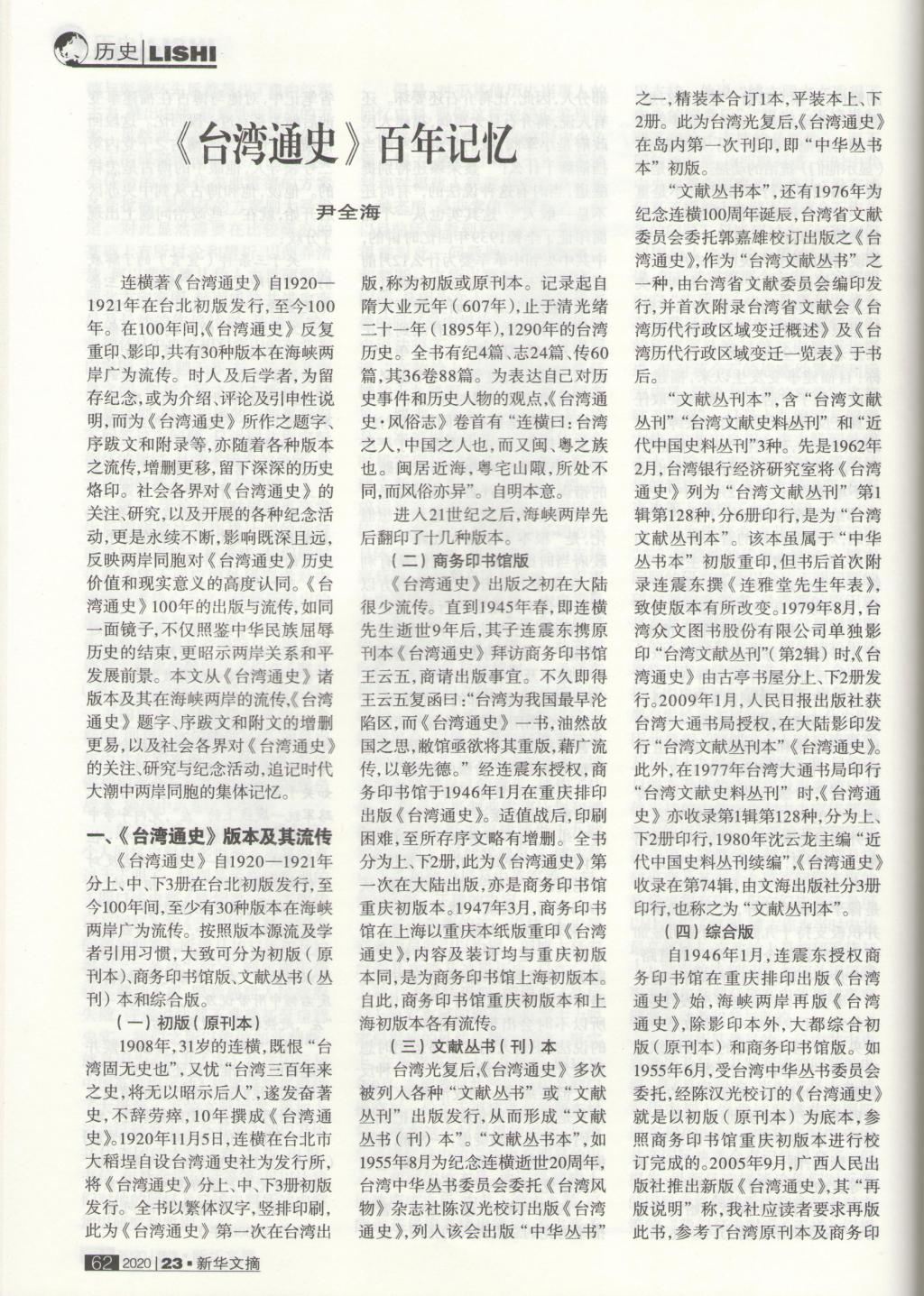编者按:最新一期《新华文摘》(2020年第23期)全文转载了我院院长尹全海教授发表在《信阳师范学院学报》 (哲学社会科学版)(2020年第5期)的论文“《台湾通史》百年记忆”。这是尹全海教授在我校学报发表论文第二次被全文转载。上次被全文转载论文发表在《新华文摘》(2018年第15期),题目为“炎黄学研究对象述论”。尹全海教授长期深耕从事根亲文化与两岸交流、炎黄文化与炎黄学研究,不断推出学术精品力作,最新学术研究成果被《新华文摘》全文转载,既是对尹全海教授学术成果的肯定,也是对我校学报选题策划统筹、特色栏目建设、编辑队伍优化和评审质量提升的褒扬,说明我校教师和学报学术成长发展联动效应明显。