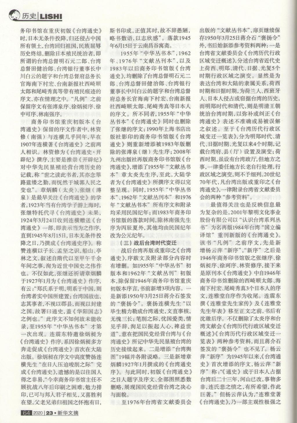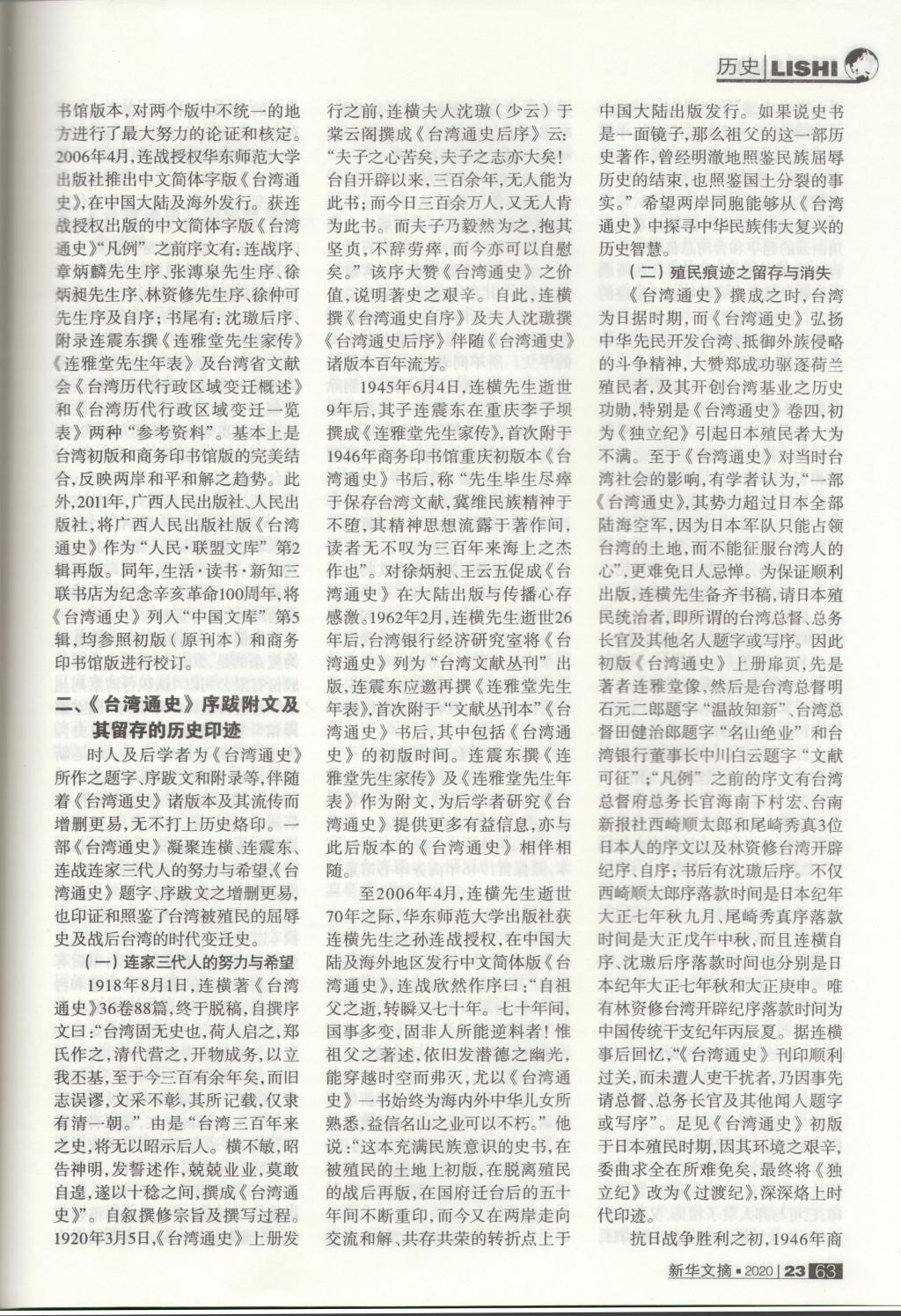 论文整体分为四个部分,一是《台湾通史》版本及其流传,二是《台湾通史》序跋附文及其留存的历史印迹,三是《台湾通史》的研究与纪念活动,四是结语,全文共12000余字。