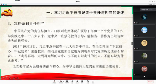 教工一支部书记孙炜同志面向tyc522cc太阳成集团全体党员讲述了了以《共产党员的责任与担当——疫情期间的一点思考》为题的党课;教工二支部、教工三支部认真学习了《习近平总书记关于民法典的重要讲话》。