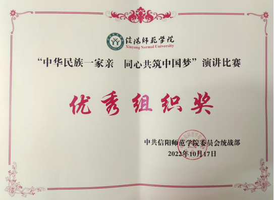 【学院荣誉】我院荣获信阳师范学院“中华民族一家亲 同心共筑中国梦”演讲比赛优秀组织奖