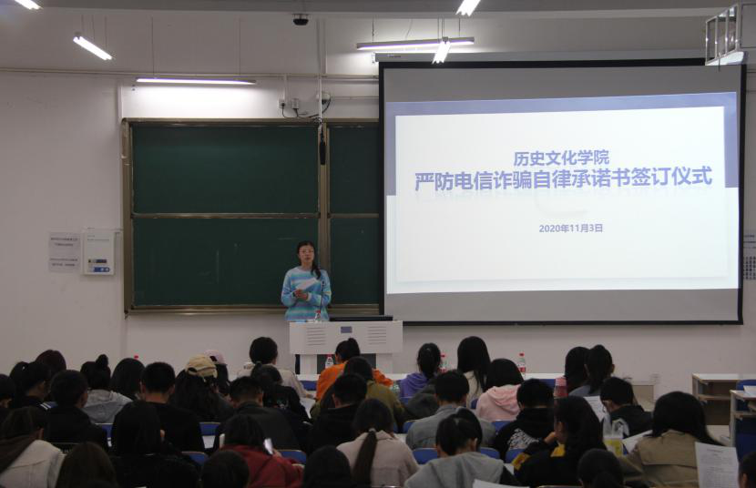 11月3日,我院团委老师付亚男在社科楼212教室主持进行严防诈骗安全意识教育和自律承诺书签订仪式,我院全体2020级新生参加。