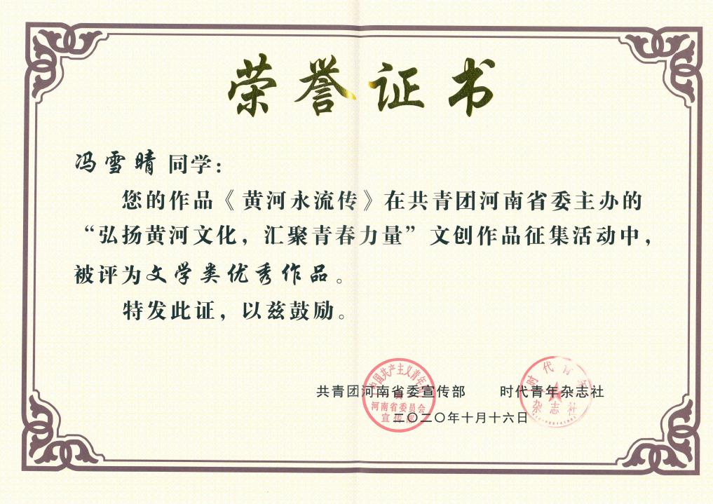 近日,由共青团河南省委主办,由共青团河南省委宣传部、时代青年杂志社、河南省青少年全媒体中心承办的“弘扬黄河文化,汇聚青春力量”文艺作品征集活动落下帷幕。我院2019级历史学2班学生冯雪晴作品《黄河永流传》被评为文学类优秀作品。