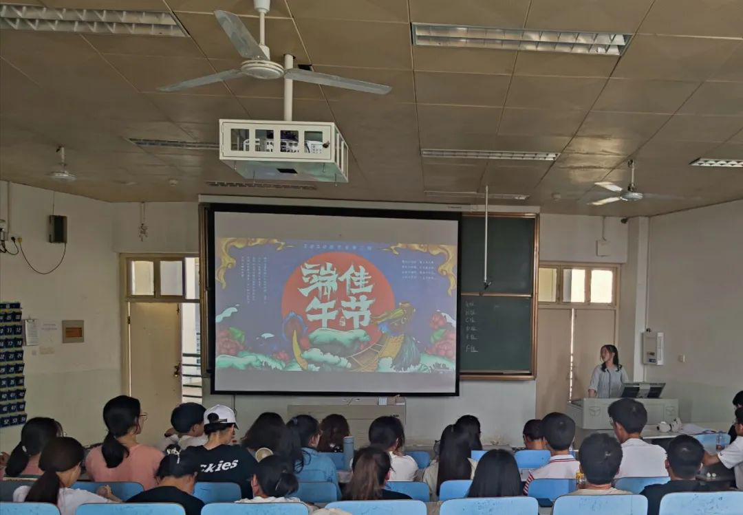 主题团日活动首先通过一段短视频介绍端午节的历史渊源,随后刘家祺和胡灿同学通过讲故事的方式,分别讲述了端午节喝雄黄酒的传说和关于曹娥救父的故事,诙谐幽默地向同学们介绍了端午节的习俗和由来。采用分小组参与端午知识竞答,累计分数最高小组将获得一份纪念品,各小组你追我赶,现场氛围热烈。梁银轲、刘鹏雪、郭程扬、刘飞扬、王跃东五位同学朗诵《一梦逍遥》,展示了代表时代精神、百姓情结和民族文化的屈原屈大夫。朗诵之后通过传统民间助兴小游戏击鼓传花,分享端午小风俗,让同学们在欢声笑语中学习传统文化。五彩绳源于我国古代的五行观念演变而来,在端午节佩戴五色丝线以辟邪,兼有祈福纳吉的美好寓意,老师和同学们亲手编织属于自己的彩绳,作为送给自己端午节的第一份礼物。最后,在场人员合唱《离骚》,在欢快轻松的氛围里结束了本次活动。