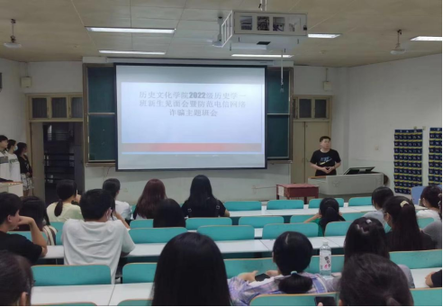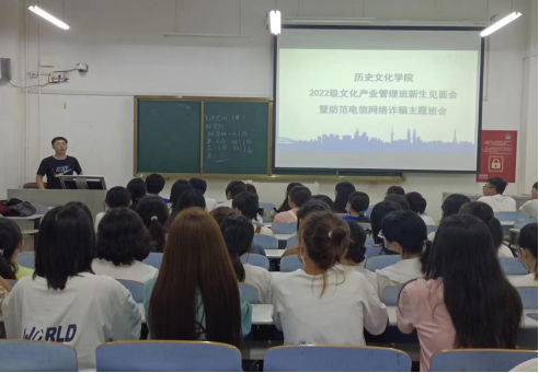 2022年9月18日晚,我院2022级新生见面会暨防范电信网络诈骗主题班会在人文楼举行。本次活动由2022级历史学及文化产业管理专业五个新生班同步举行。各班班主任分别主持会议。