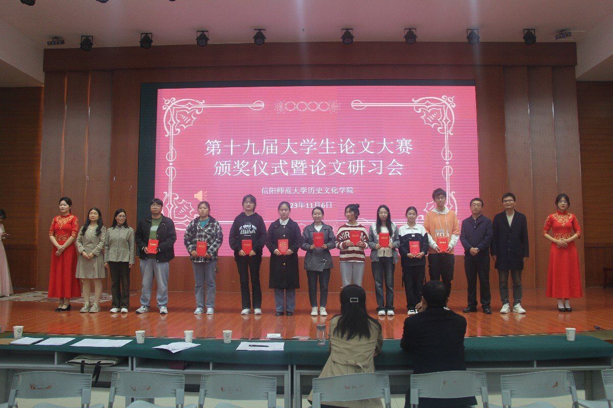 活动伊始,主持人介绍了研习会是旨在提高学生的科研能力,活跃学术思想,提高同学们的论文写作能力和学术创新参与率。李志坚宣读本次研习会论文获奖名单,由各位领导嘉宾为获奖同学颁奖。欣赏完民族舞《爱我中华》表演后,进入论文汇报阶段。2020级历史学3班韩爽、2021级文化产业管理班任思莹、2021级历史学2班田艳瑞、2021级历史学1班王江涛和2020级历史学1班王雨航分别阐述了自己的论文《民国时期河南光山县公路交通与经济发展》《互联网背景下信阳毛尖品牌形象塑造研究汇报》《明清安庆地区黄梅戏传入问题研究》《宋代修景与地方秩序——从士大夫的政治逻辑说起》《〈土官底簿〉所见明朝西南地区土官类型研究》。五位同学的论文选题新颖、结构完整、逻辑清晰,充分展现了我院学子良好的学术文化素养。各位评委老师点评精准到位,既肯定了论文的现实意义,也提出了可行性修改意见,深入浅出,令同学们受益匪浅。最后李辉作了总结发言,他首先感谢了长期以来支持和关注我院建设发展的领导老师,宣布第十九届大学生论文大赛已圆满画上句号。他勉励同学们要担当责任和使命,深入学习贯彻习近平文化思想,要坐得了冷板凳,敢于走出书房,迈向祖国大地,让习近平文化思想之花绽放在祖国的每一个角落。