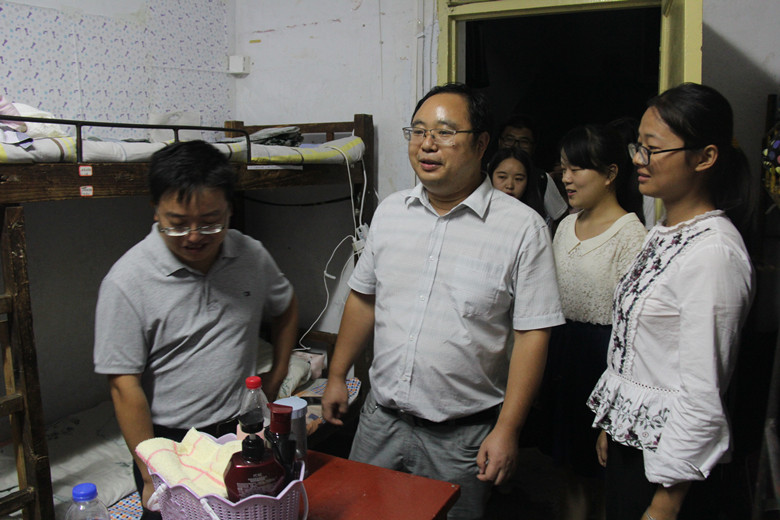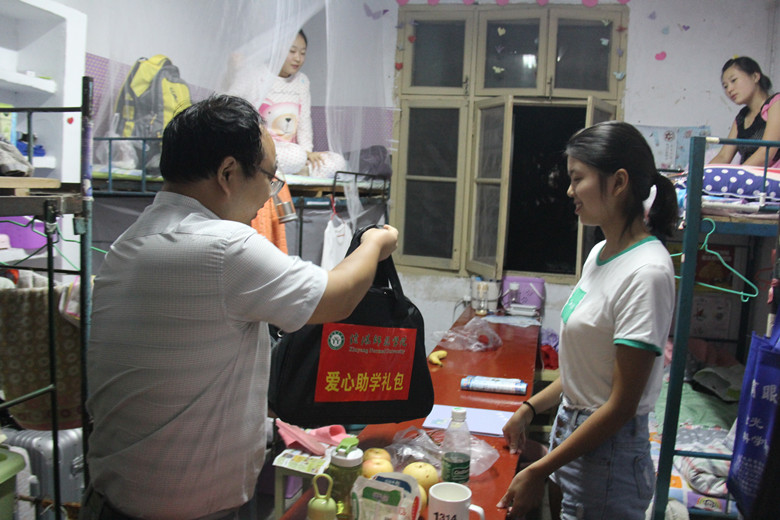 9月11日,新生报到后的第一天,受我院党委书记李军辉、院长尹全海委托,党委副书记刘喜元和2017级新生班主任一起前往宿舍,看望慰问家庭经济困难新生,为困难新生送上一份“爱心大礼包”。