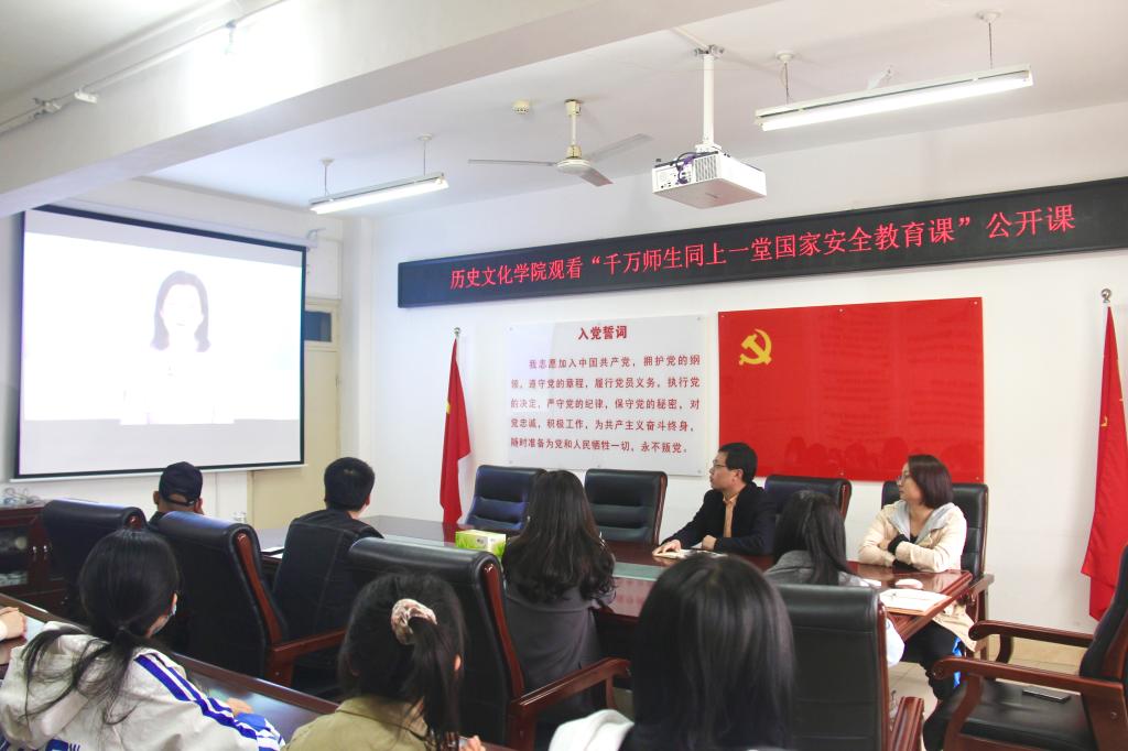 为深入学习贯彻习近平新时代中国特色社会主义思想,落实习近平总书记关于教育的重要论述和习近平法治思想,进一步推进tyc522cc太阳成集团依法治教、依法治院和依法办学,持续提升学院党建工作标准化、规范化、信息化水平,根据《学院“基层党建质量提升年”活动实施方案》的既定安排,4月14日下午,学院在人文楼805会议室举行法治教育宣传启动仪式,仪式后组织师生共同观看“千万师生同上一堂国家安全教育课”公开课。tyc522cc太阳成集团党委书记李辉出席活动。