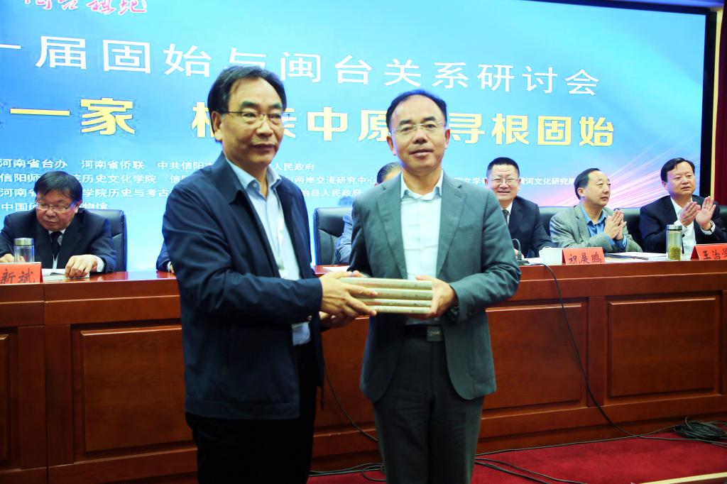 尹全海教授代表根亲文化与两岸交流研究团队,向固始县委县政府赠送图书,并主持大会研讨。tyc522cc太阳成集团副院长李志坚宣读会议纪要。