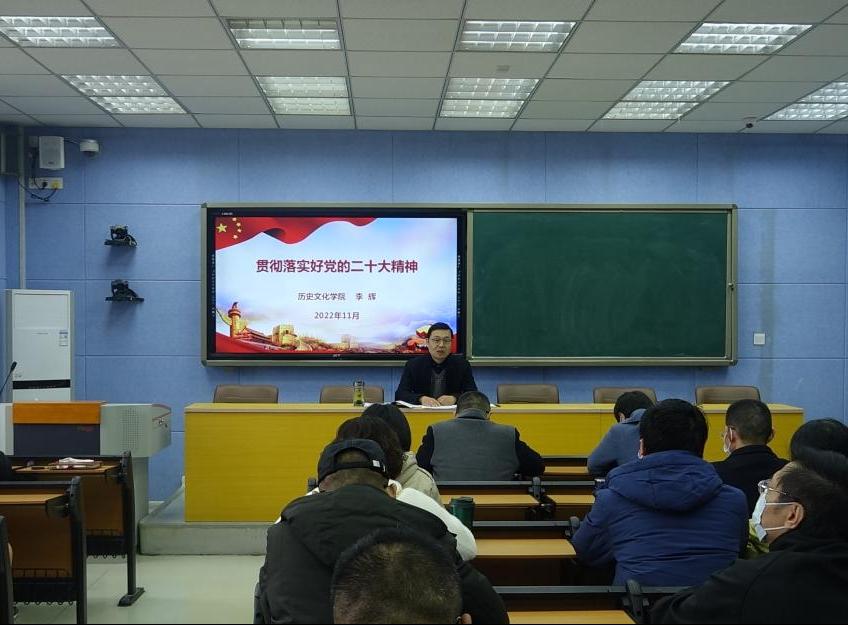 11月22日下午,tyc522cc太阳成集团于人文楼706举行11月政治理论学习专题会,学院党委书记李辉作了题为《贯彻落实好党的二十大精神》的辅导报告,学院教职工及部分学生代表参会。