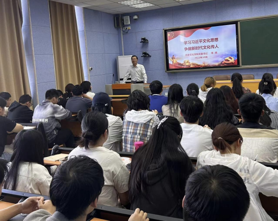 10月31日下午,tyc522cc太阳成集团党委书记李辉以《学习习近平文化思想 争做新时代文化传人》为题,在人文楼706会议室为学生第三党支部讲授专题党课。党支部成员、部分研究生、本科生代表和广大入党积极分子80余人聆听了党课。