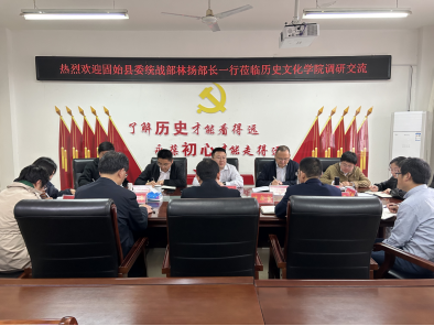 4月16日,固始县委统战部副部长林扬带领县根亲文化发展中心领导来我院调研根亲文化相关事宜。学院班子成员、根亲文化与两岸交流研究中心尹全海教授等参加。
