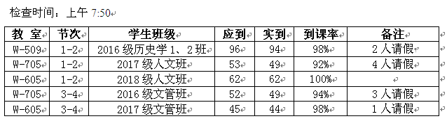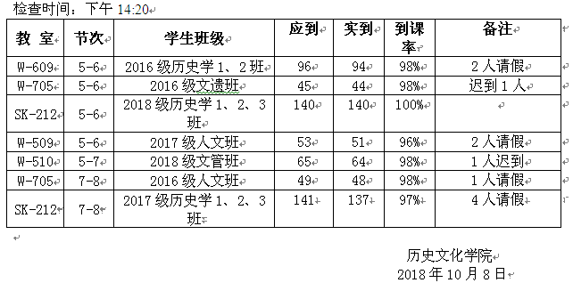 为进一步规范教学管理,维护正常教学秩序,确保教学工作顺利开展,2018年10月8日,我院教学自查小组对上课班级师生到课情况进行了检查,现通报如下:
